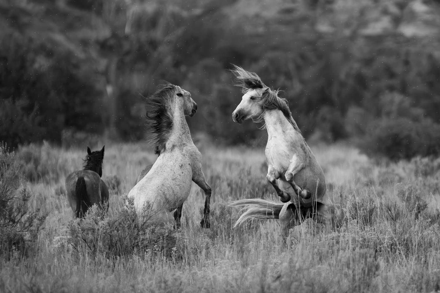 I took this photo in May of 2023, within the sweeping grasslands of Theodore Roosevelt National Park. Two wild stallions erupted into a display of raw power and dominance. Their hooves cut through the prairie, manes whipping in the wind. This black-and-white portrait preserves the untamed spirit of the park—where the rhythms of nature still play out, unbroken and free.
