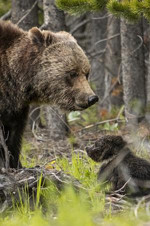 In the shadowed pines of Yellowstone, a grizzly mother paused to meet the gaze of her smallest cub. Her expression—soft, almost smiling—was a fleeting reminder that even the wildest creatures hold moments of gentle connection. Taken in May 2023, this image was captured during an unexpected encounter with the mother and her three playful cubs, each tumbling through the spring grass under her watchful eye.