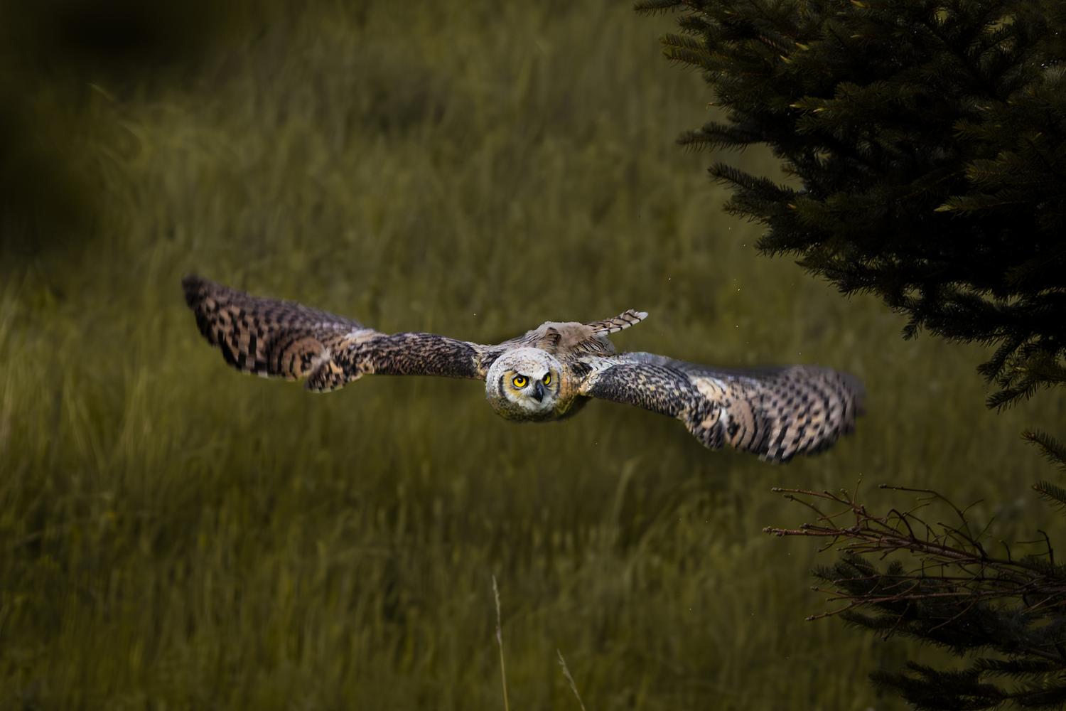 In May 2023, on the quiet east side of Ennis Lake, I spent several days returning to a downed tree where a great horned owl and her three owlets had made their home. I watched as the young ones tested their wings, each attempt brimming with both uncertainty and instinct. On this day, one brave owlet leapt from the shelter of a pine, only a few feet above the ground, and spread its wings in a determined glide. This image freezes that fleeting moment—a young life caught between the safety of the nest and the vastness of the sky.